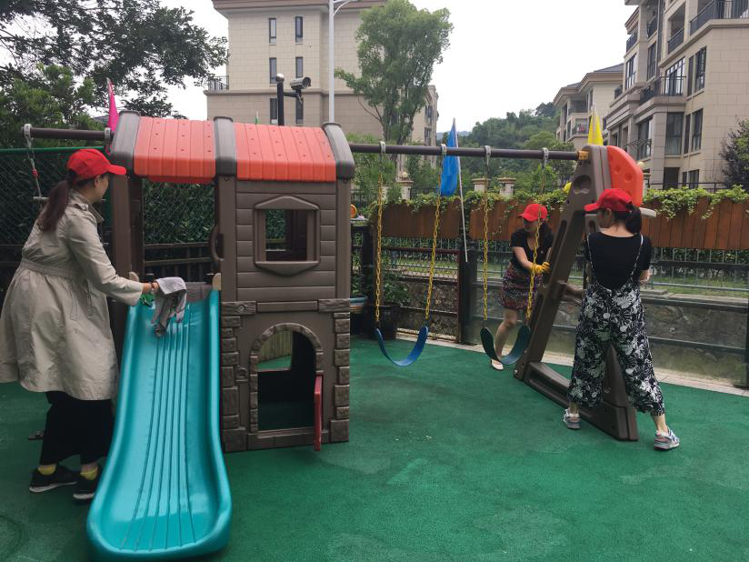 学习近平重要讲话,做幼儿园守护卫士。秉持理论联系实际,会后全体党员教师佩戴党徽,头戴小红帽,撸起袖子一起干,将幼儿园园所内的各大型玩具器械等进行清扫与擦拭,对周边犄角旯旮的死角进行了清理。为保障幼儿良好游戏环境,确保幼儿活动安全而尽显自己的一份力量。(新城三幼党支部)